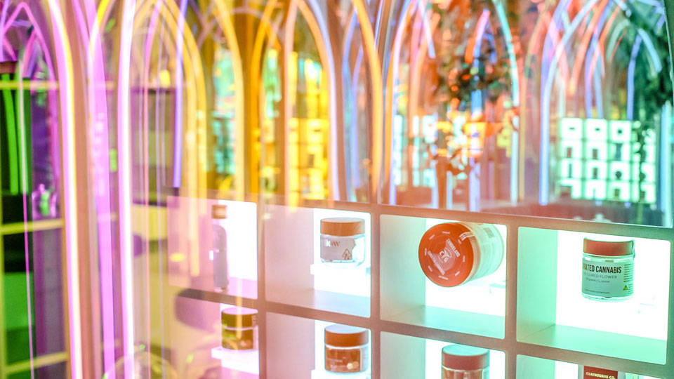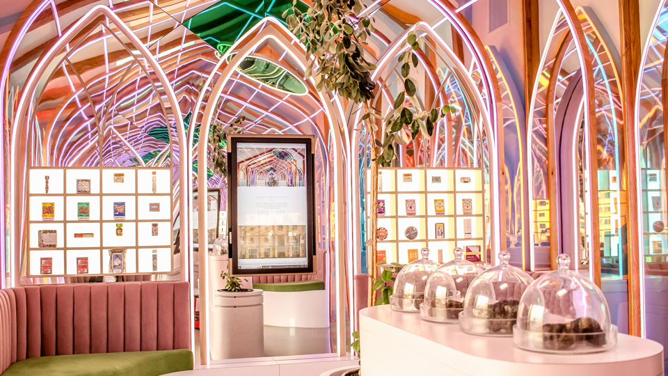 Nesse sentido, as luzes LED coloridas dentro dos arcos altos mudam de cor ao longo do dia. A loja oferece aos clientes sons e cheiros em toda a experiência do dispensário, com áudio da natureza ambiente e até mesmo ASMR de cannabis, ouvido pelos alto-falantes. Sob o mesmo ponto de vista, os consumidores encontrarão uma instalação educacional de aroma de terpeno, substâncias que conferem cheiro e sabor às plantas.