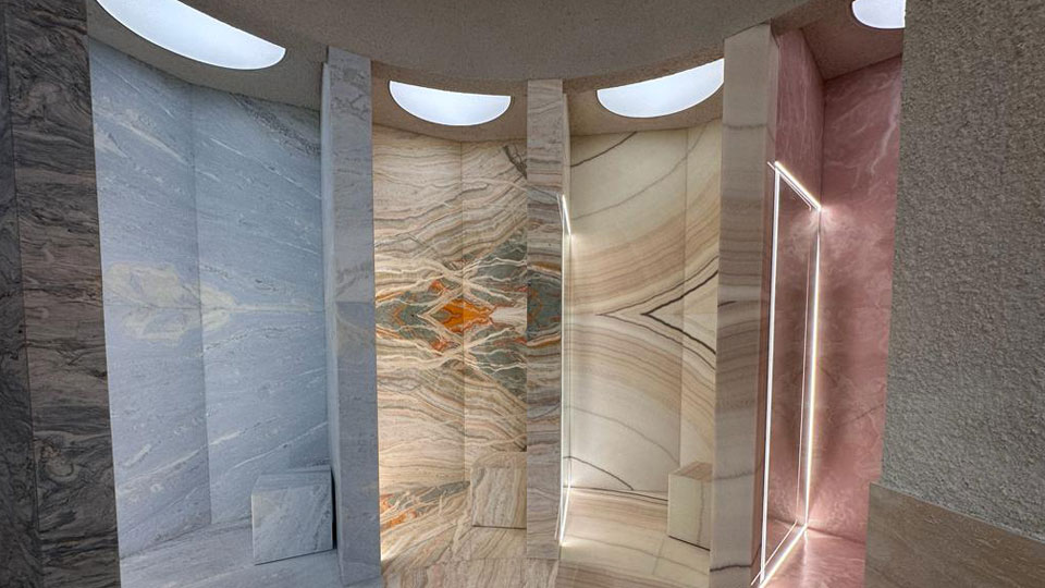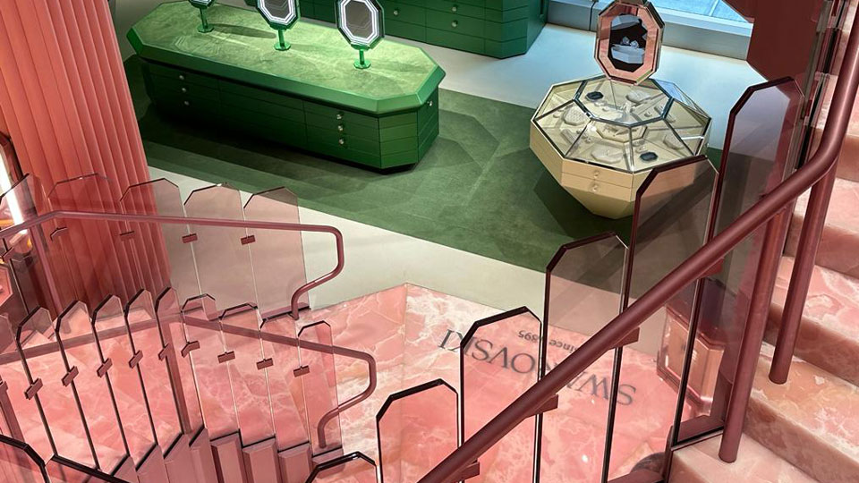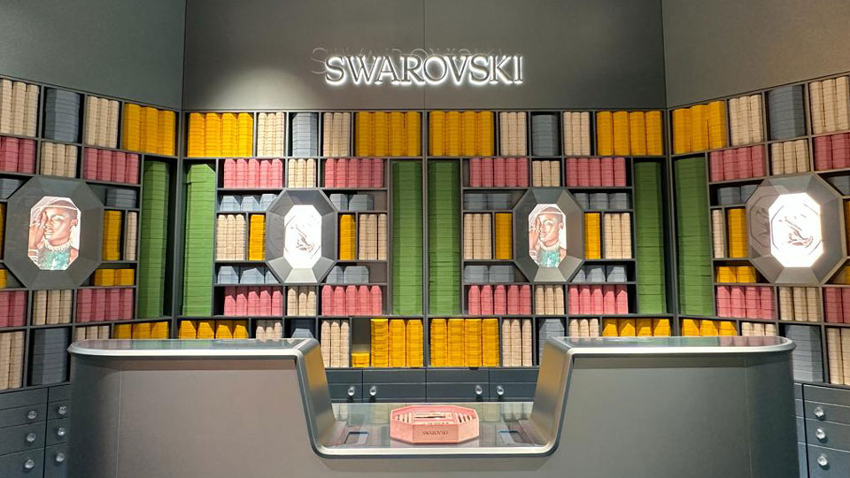 A loja foi projetada para capturar a essência de uma caixa de joias, repleta de tesouros cintilantes. Conseguimos ver nos vídeos e fotos, elementos-chave da marca como o octógono da Swarovski, presentes em todo a loja, desde vitrines até maçanetas de cristal.