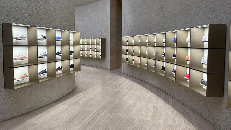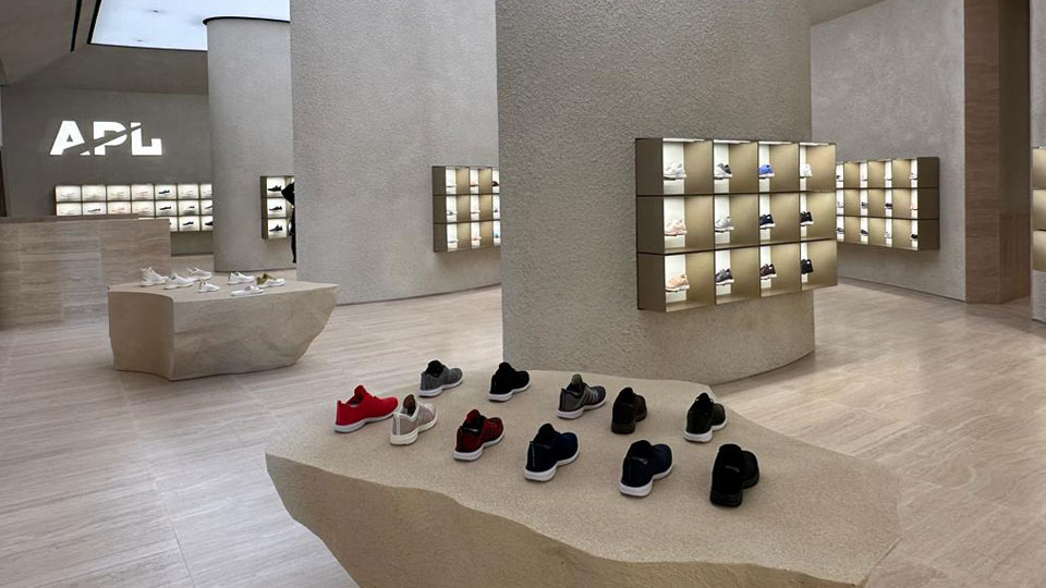 A APL, que significa Athletic Propulsion Labs, é pioneira na venda de calçados de luxo de alta performance. A loja no Soho tem um design simples e minimalista, com uma iluminação diferente das lojas de calçados tradicionais. Os calçados expostos em boxes iluminados deixam a experiência do cliente semelhante a uma galeria. Outros calçados são expostos em bases em forma de pedra, com topos achatados para destacar os sapatos colocados em cima deles, iluminados de cima para criar uma sensação de cerimônia. Eventos e atividades relacionados a saúde e fitness são frequentemente realizados na loja, criando uma comunidade vibrante para os entusiastas do esporte.