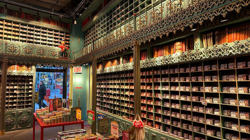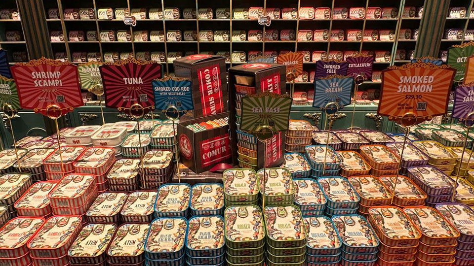 “The Fantastic World of the Portuguese Sardine” dá um verdadeiro show de visual merchandising. Latas coloridas de sardinhas portuguesas embaladas em azeite ocupam dois andares de prateleira. As latas coloridas, em edições comemorativas e sabores adicionais, são organizadas cronologicamente de 1916 até o presente. Olhar as paredes da loja dá a impressão de que você entrou em uma imponente biblioteca. E é claro que, com esse cenário incrível, os clientes podem experimentar sardinhas portuguesas autênticas!