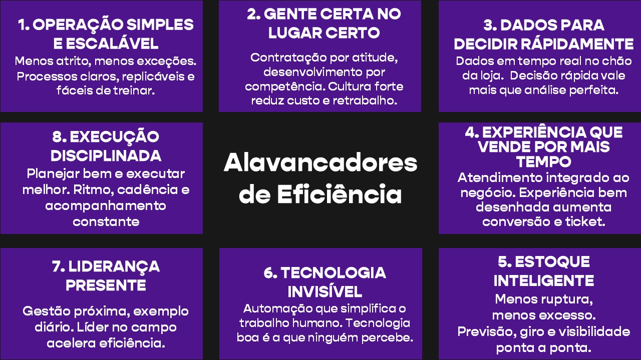 Eficiência é o alicerce de coragem para a marca. Garantir os melhores custos e a melhor operação garante que a marca não se sinta ameaçada e se libere para inovar. Sem eficiência, o medo paralisa o varejo e é assim que as marcas caminham para a derrocada.