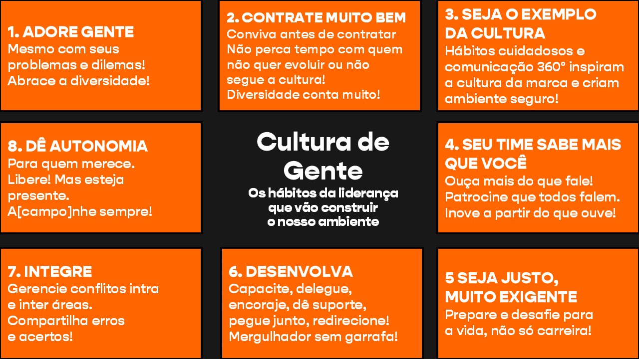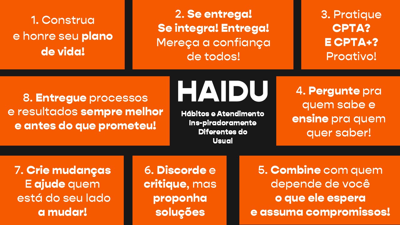 Para ter uma equipe muito competente, o que é mais importante: contratar ou treinar? Muita gente responde “treinar”, mas na verdade é “contratar”. Se eu não contratar a pessoa corretamente, eu vou ter muito trabalho para transformar essa pessoa em quem eu quero. Missão absolutamente impossível. Pensando na cultura da empresa, eu tenho que contratar alguém que pense e viva essa cultura. Aí eu vou conseguir formar a equipe na competência que eu quero. Óbvio que não dá para a gente saber se a pessoa é ou não o que ela diz ser sem convivência. O que eu sugiro, então, é que a pessoa seja submetida a este quadro para dizer o seguinte: “Você topa trabalhar num ambiente onde você tenha que ser assim?”. Pronto! Aí é só conviver tempo suficiente para entender se sim ou não, se essa pessoa é HAIDU.