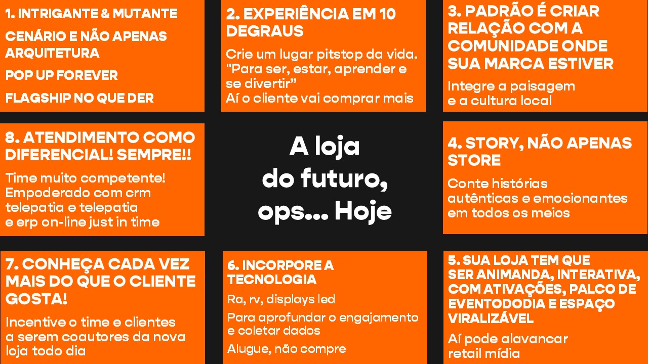 Disclaimer: se você está esperando um pós-NRF que conte o que foi falado em Nova York, infelizmente não vai ser este aqui. Eu vou à NRF há mais de 30 anos e aprendi que uma NRF não é isolada; ela vem de alguns anos e dura alguns anos. Portanto, eu incorporo aqui as coisas que eu acho que têm que ser praticadas a partir do que foi falado lá, acrescentando os campos cultura, pessoas e experiência do cliente. Coisas que eu aprendi ao longo da vida e que vão ajudar você no seu dia a dia, na prática. Bora lá, então?