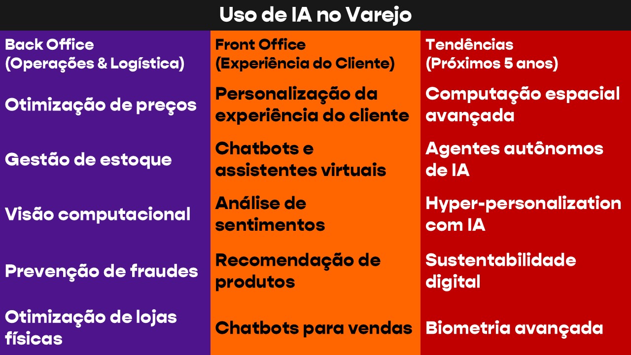 A IA vai continuar a evoluir do balcão para trás e do balcão para a frente. O Big Show da NRF mostrou que muitos varejistas estão experimentando e agindo. Errar é parte do aprendizado. No quadro abaixo por onde a IA está caminhando. Fiquei muito feliz em NY porque ninguém está atribuindo à IA a responsabilidade por hiperpersonalização. Nada vai substituir ouvir profunda e continuamente o cliente. Afinal, como eu não canso de repetir: quando ele confia no ouvinte, ele confessa tudo. Como gosta de comprar, de ser atendido, detalhes de consumo, parentes queridos… tudo!